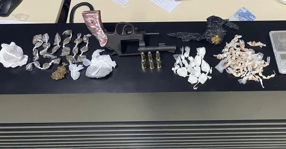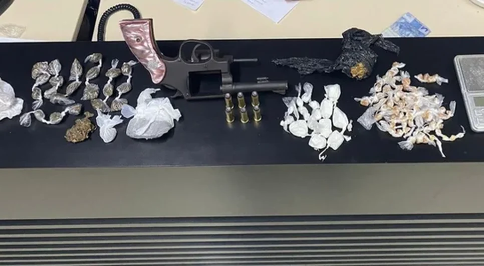 Ao entrar na residência, os policiais confirmaram que o suspeito portava um revólver Taurus calibre 38. Quando questionado sobre outros itens ilícitos, o suspeito indicou que sua companheira guardava drogas na casa. A mulher, de forma involuntária, entregou os entorpecentes.