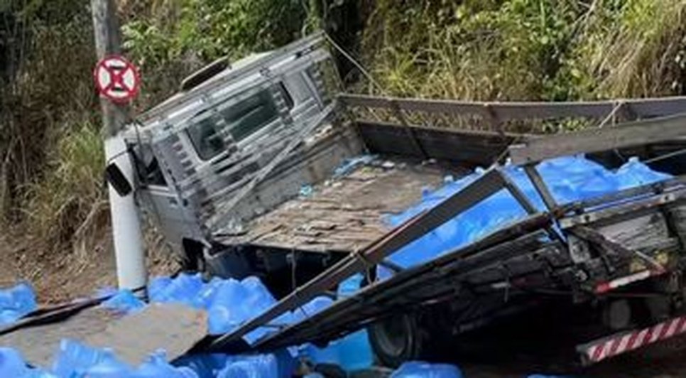 Nesta segunda-feira (2), um caminhão carregado de galões de água se envolveu em um acidente na Avenida Leste Oeste, próximo à ladeira do Bolão, durante a manhã. Parte da carga se espalhou pela rodovia.