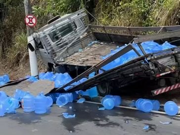 O impacto rompeu a estrutura de madeira do caminhão, causando a queda e dispersão dos galões pela rodovia.