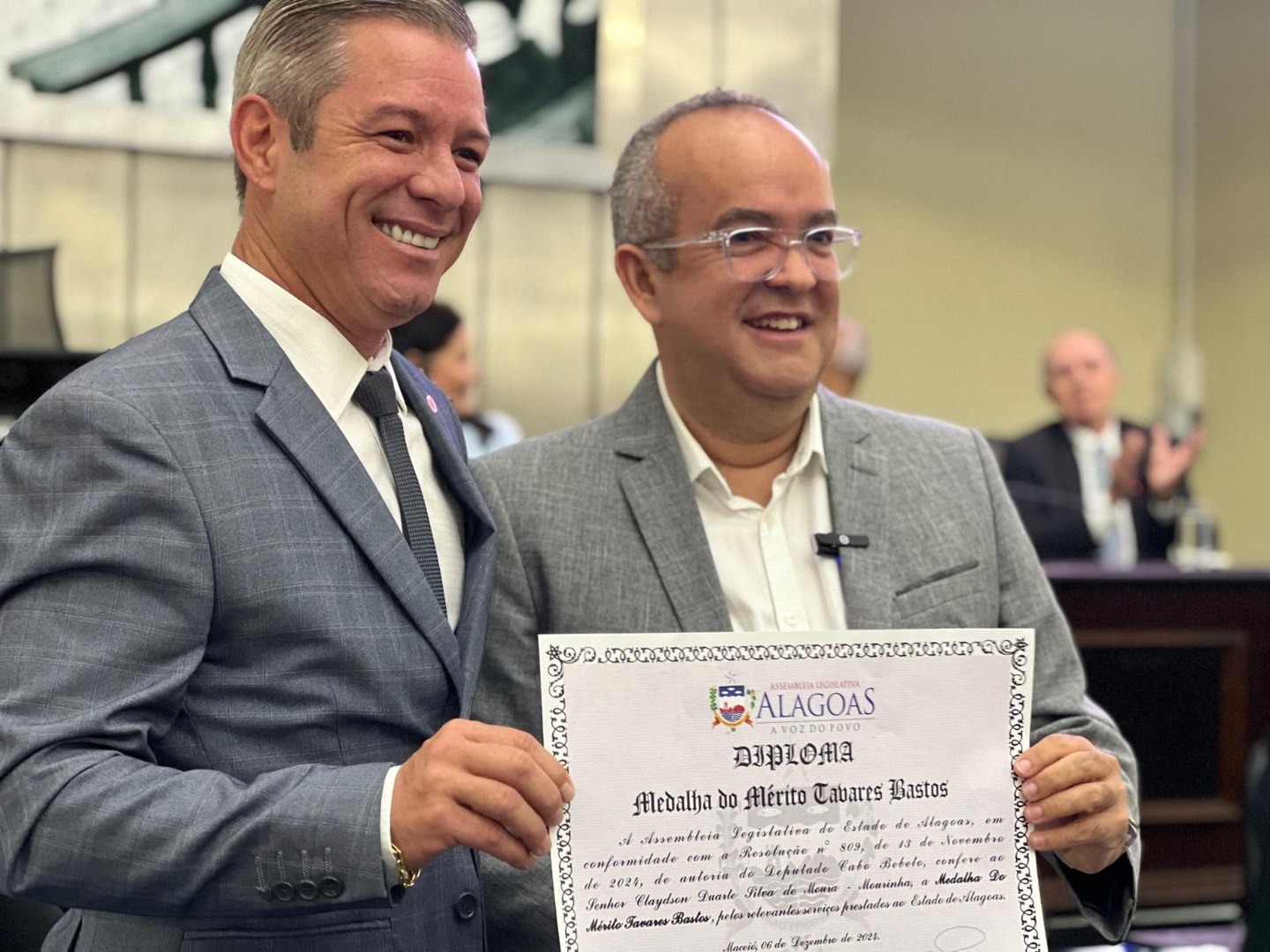Em sessão solene realizada nesta sexta-feira, 06, a Assembleia Legislativa de Alagoas (ALE) entregou a Medalha de Mérito Tavares Bastos a Claydson Duarte Silva de Moura pelos relevantes serviços prestados ao Estado. A homenagem foi concedida por iniciativa do deputado Cabo Bebeto (PL) e aprovada por unanimidade no plenário da Casa. A comenda Tavares Bastos é a maior honraria oferecida pelo Parlamento alagoano.