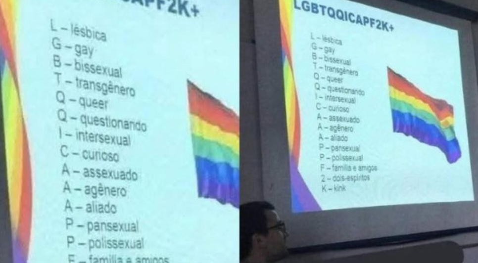 Uma imagem viralizou nas redes sociais mostrando a suposta atualização da sigla LGBTQIAPN+, que representa a diversidade de identidades e orientações sexuais. A "nova" sigla foi exibida durante apresentação em sala de aula e chamou a atenção de internautas que têm debatido o tema no X (antigo Twitter).