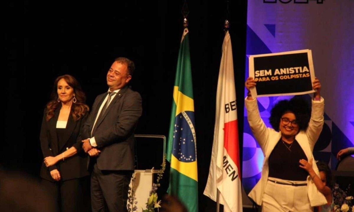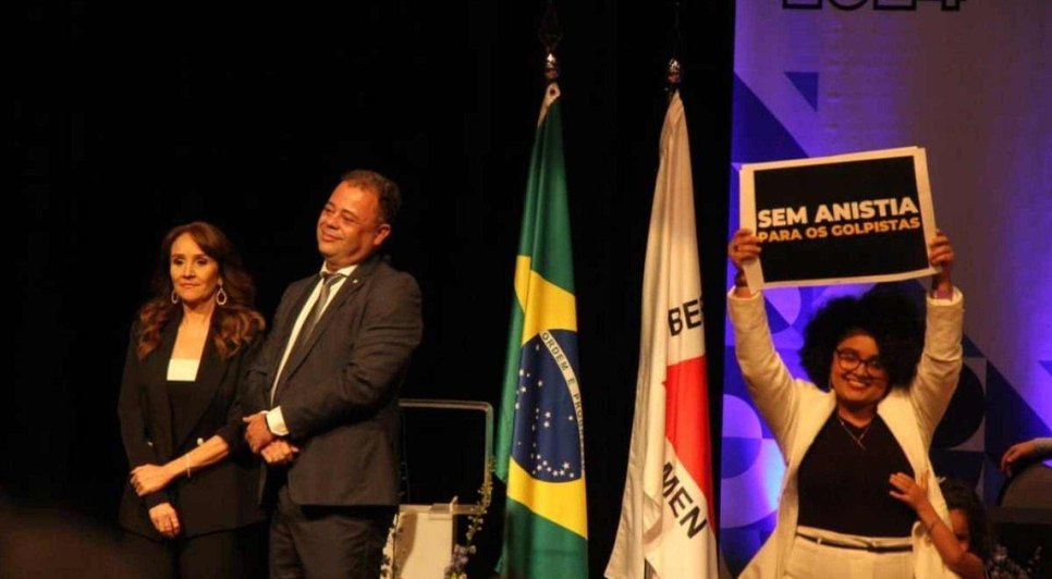 Após ser diplomada para seu segundo mandato na Câmara Municipal de Belo Horizonte, a vereadora Iza Lourença (PSOL) exibiu uma placa com os dizeres "Sem anistia para os golpistas" durante a cerimônia nesta quarta-feira (18). A ação gerou reações mistas, com aplausos e vaias no evento.