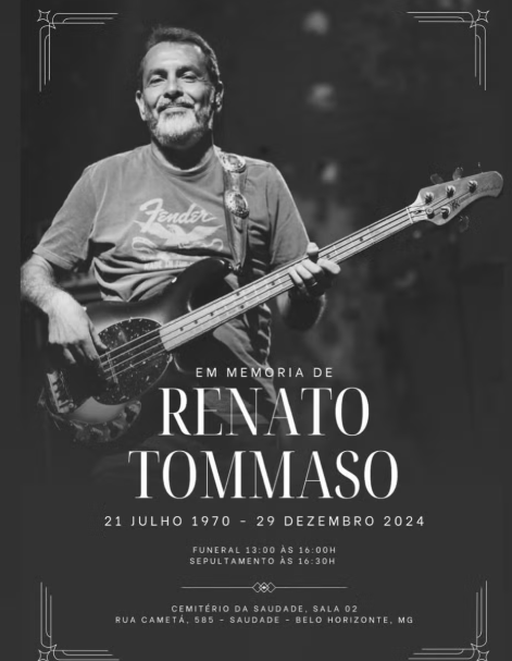 Morreu no domingo (29) o baixista da banda Jota Quest, Renato Tommaso, aos 54 anos. A notícia da morte foi dada pelo amigo e parceiro de banda, Rogério Flausino. O músico fazia parte do grupo há 18 anos. A causa da morte não foi divulgada.
