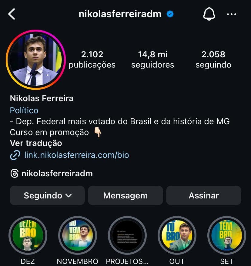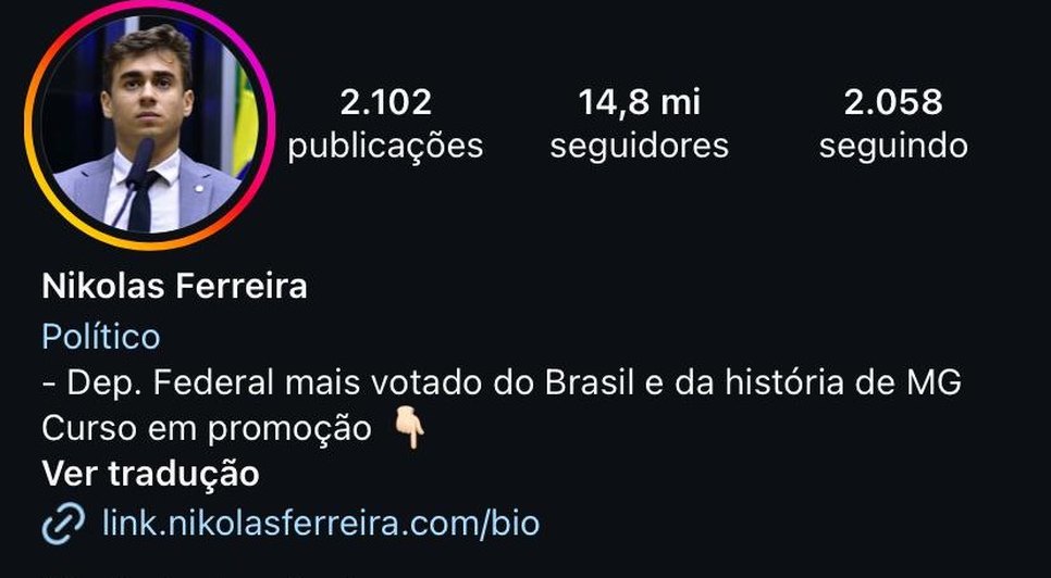 O deputado federal Nikolas Ferreira (PL-MG) ultrapassou o presidente Luiz Inácio Lula da Silva (PT) no número de seguidores no Instagram. Nikolas possui, até a publicação desta matéria, 14.800 milhões de seguidores, contra 13.300 milhões do petista.