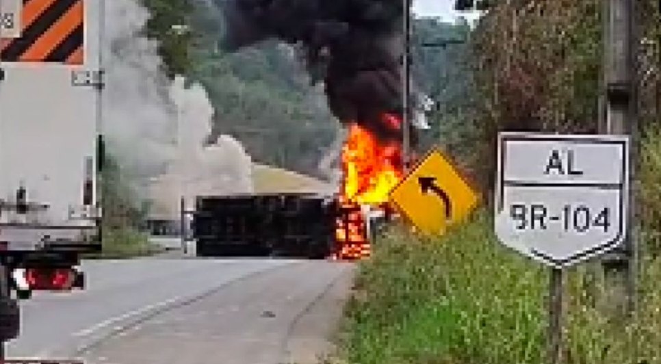 A carreta tombou e pegou fogo na Curva da Melancia, na BR-104, em São José da Laje, zona da mata de Alagoas na manhã desta quarta-feira (29).