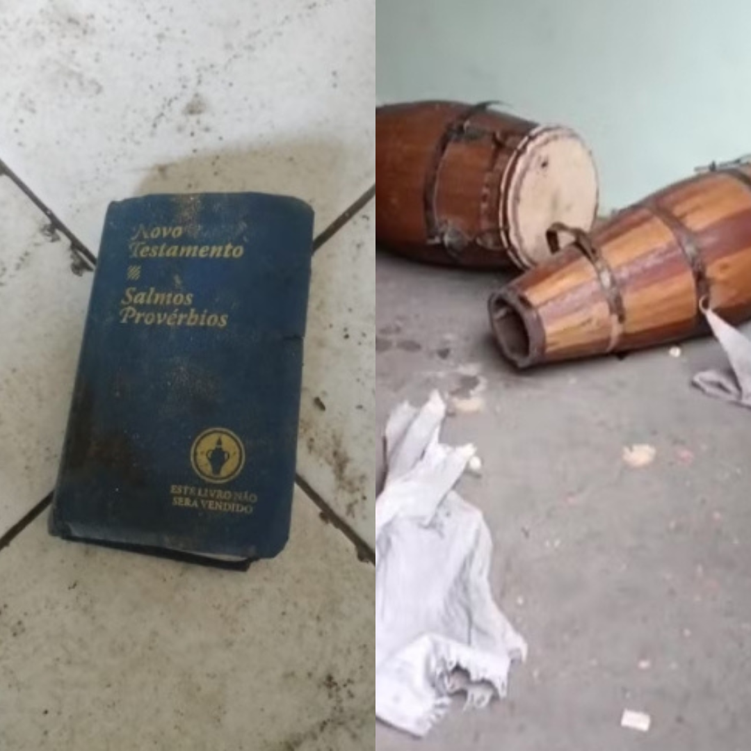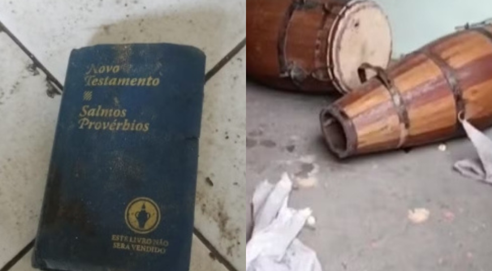 Também foram destruídas imagens sagradas e atabaques, os criminosos deixaram uma bíblia na entrada do local.