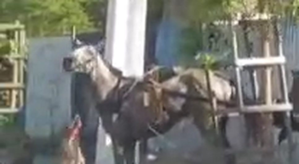 Dois cães da raça pitbull foram flagrados atacando dois cavalos na Avenida Durval de Góes Monteiro, no trecho do Jardim Petrópolis, parte alta de Maceió, na manhã deste sábado (1). Um vídeo registrado por um motorista mostra os cachorros, um preto e outro caramelo, mordendo o focinho e o pescoço de um cavalo que puxava uma carroça. Durante o ataque, o veículo de tração animal se enroscou em uma árvore, dificultando a fuga dos equinos.