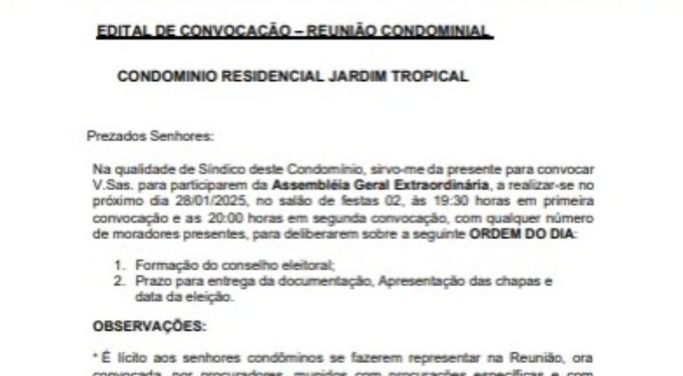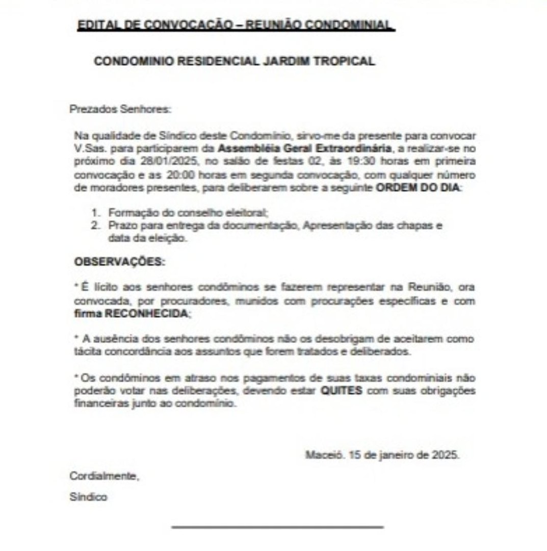 Diante dos fatos, a administração do condomínio estuda as medidas cabíveis para garantir que o processo eleitoral ocorra dentro da legalidade e da convenção condominial, respeitando o direito de participação de todos os moradores.