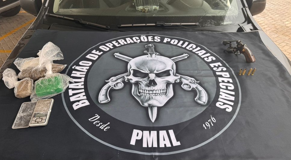 A Polícia Militar de Alagoas apreendeu, na quarta-feira (5), um revólver calibre 38, 400 gramas de maconha e uma balança de precisão, após denúncia sobre tráfico de drogas. No local, um homem reagiu à abordagem da PM, efetuando disparos contra a guarnição. Ele acabou sendo atingido durante a troca de tiros e foi encaminhado ao Hospital Geral do Estado (HGE), onde supostamente veio a óbito.