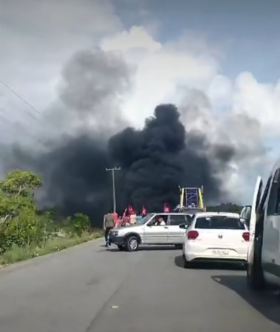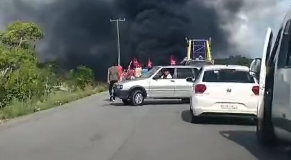 Nas imagens registradas por moradores, é possível ver a fumaça preta dos pneus que foram queimados pelos manifestantes, para bloquear a passagem dos veículos.