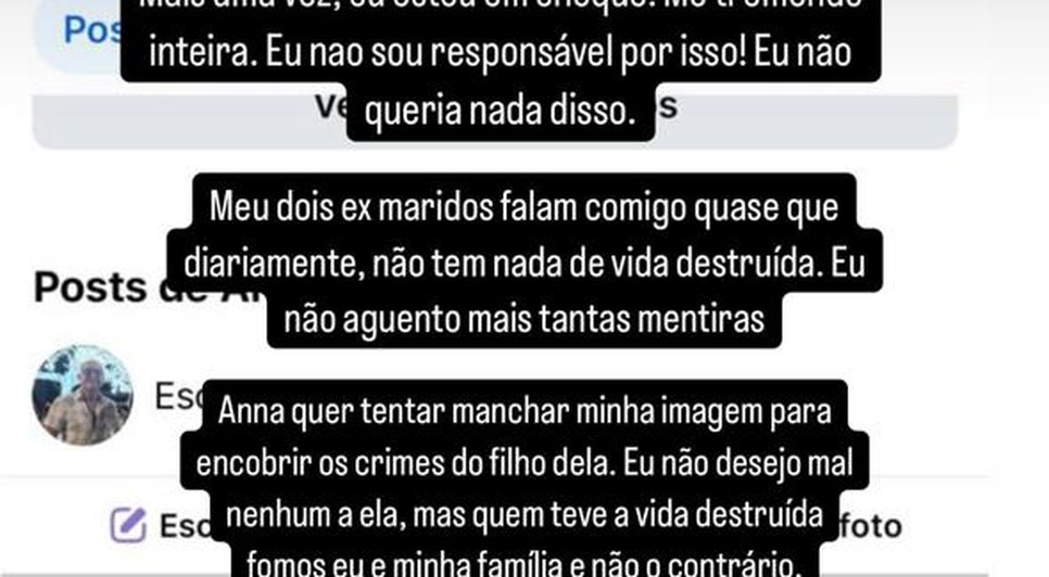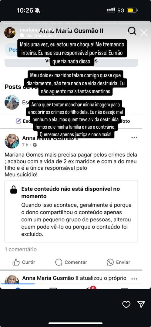Nos últimos dias, Mariana expôs mensagens trocadas com a ex-sogra, nas quais Anna Gusmão a ameaçava e dizia que faria de sua vida "um inferno".