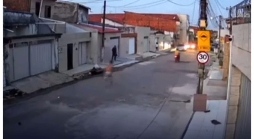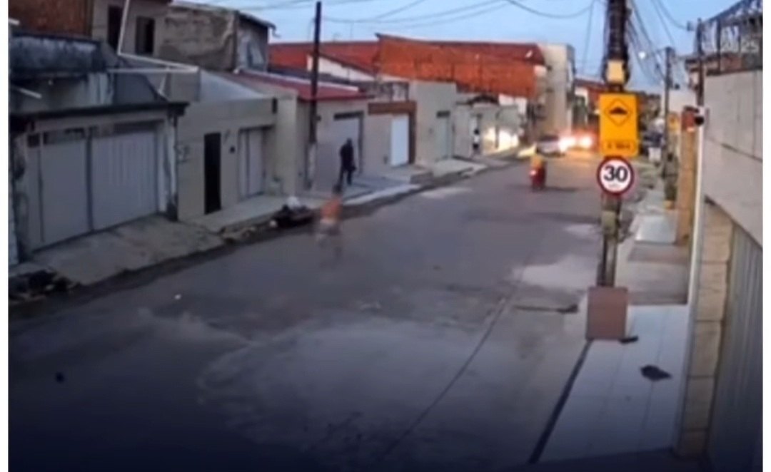 O registro foi feito na última segunda-feira (10), em Fortaleza, capital do estado do Ceará. Com o impacto da bola jogada pelas crianças, o bandido deixa o celular que havia acabado de roubar cair.