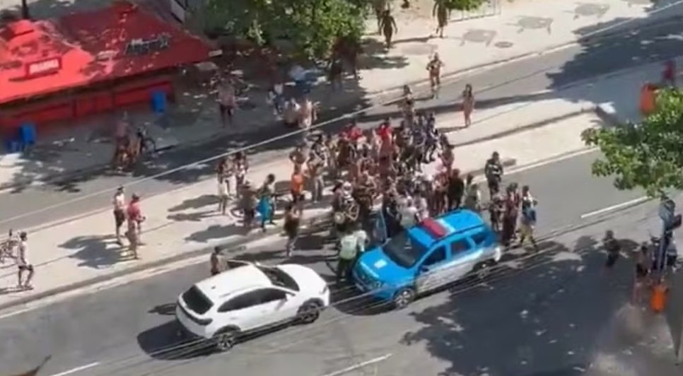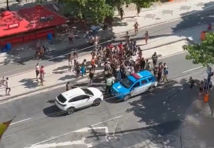 Imagens que circulam nas redes sociais mostram uma aglomeração próxima a viatura, no local da abordagem; policiais usaram spray de pimenta para dispersar o tumulto, em seguida se direcionaram a delegacia para tomar as medidas cabíveis.