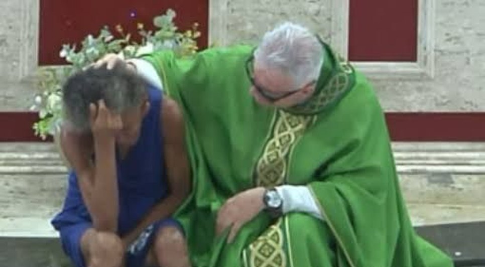 Padre abraça mulher em situação de rua que estava chorando durante missa