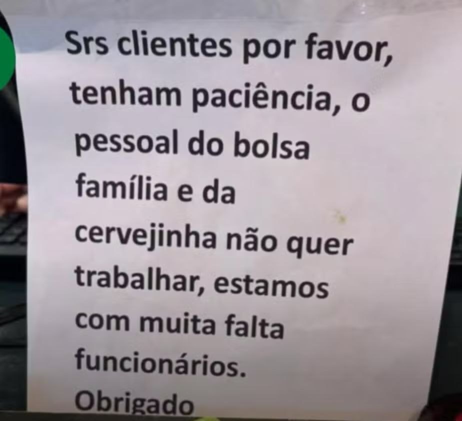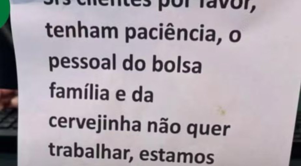 A mensagem diz: “Senhores clientes, por favor, tenham paciência, o pessoal do bolsa família e da cervejinha não quer trabalhar, estamos com muita falta [de] funcionários. Obrigado”.