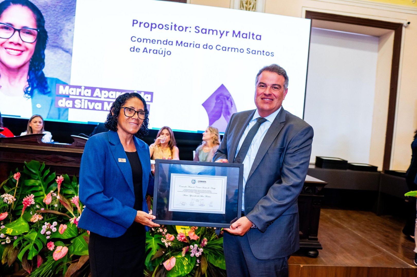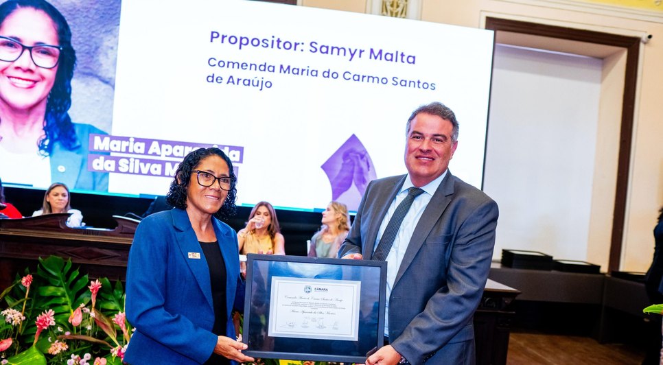 Em sessão solene realizada na segunda, 24, pela Câmara de Vereadores de Maceió, na Associação Comercial, o vereador Samyr Malta homenageou a líder comunitária Maria Aparecida Martins, a Cidinha da Transformação, com a Comenda Maria do Carmo Santos de Araújo, a “Carminha”.