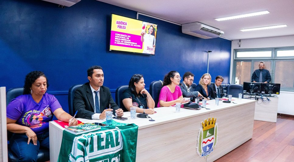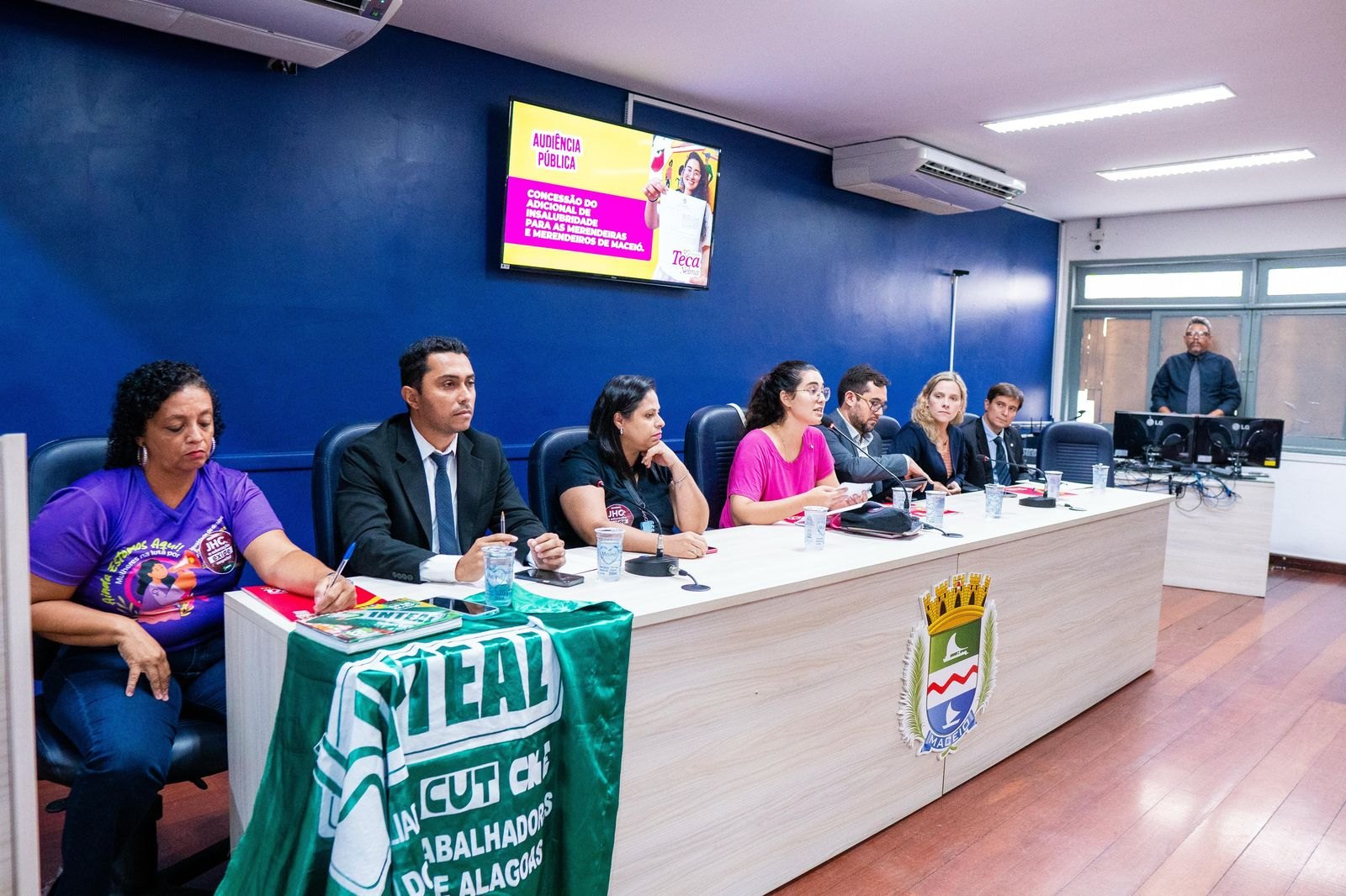 A vereadora Teca Nelma (PT) promoveu uma audiência pública na Câmara Municipal de Maceió para discutir o adicional de insalubridade das merendeiras e merendeiros da rede municipal de ensino. O encontro reuniu mais de 100 profissionais da categoria, além de representantes dos poderes Legislativo e Judiciário.