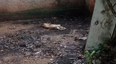 Scooby, um mestiço de vira-lata com poodle, foi encontrado em estado crítico: com infecção na pele, anemia, magreza extrema, dificuldade para andar e o pelo endurecido por sujeira. Ele estava em um corredor externo da casa, sem os cuidados necessários.