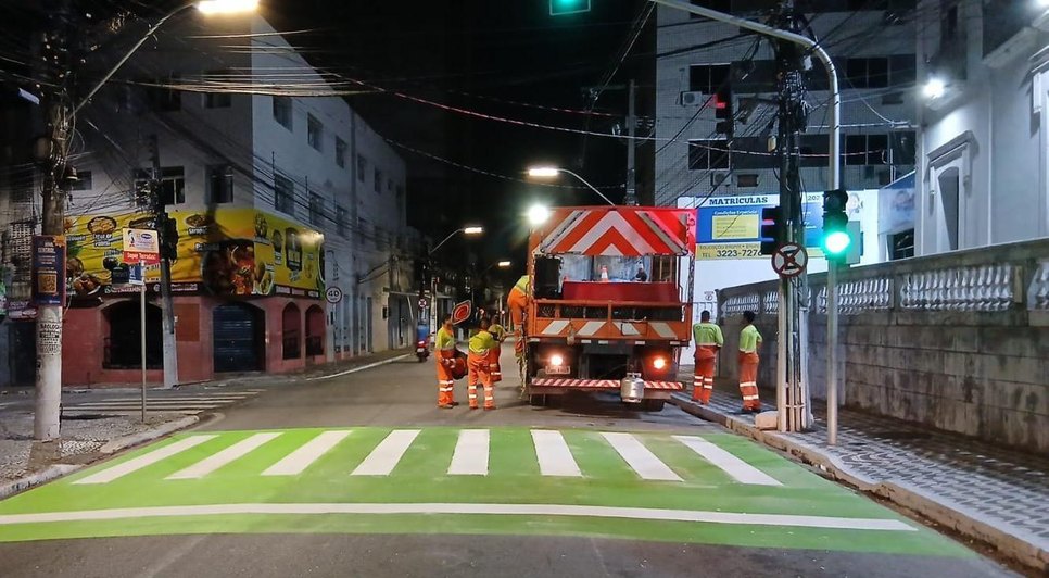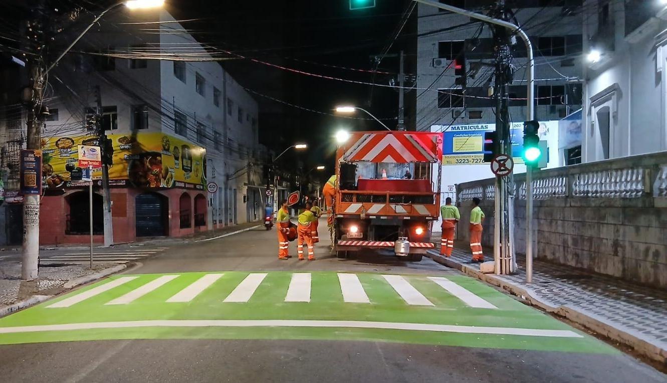 Entre os trabalhos executados estão o reforço na pintura de faixas de pedestres, a pintura de marcas de canalização e também a demarcação e pintura das vagas de táxi. O trabalho faz parte de uma série de ações do órgão municipal para a readequação do Centro.