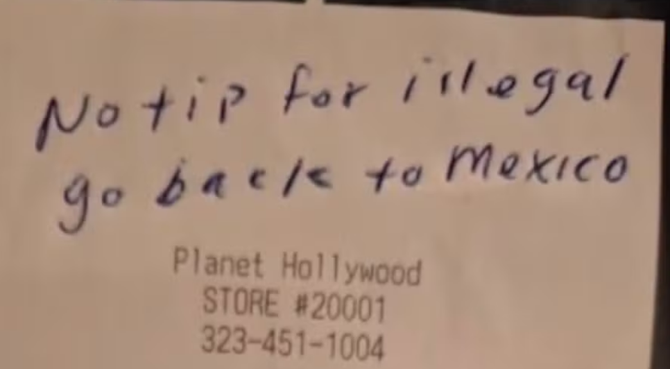 Vinte minutos depois que os clientes saíram, Ortiz abriu a pasta com o recibo e viu um recado escrito: "Não há gorjeta para ilegais. Volte para o México."