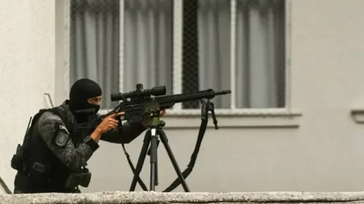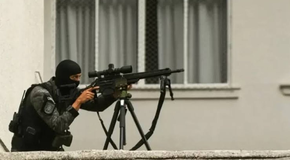 Com o rosto coberto e com uma farda, o homem tinha uma arma de grosso calibre enquanto observava a multidão. Não há informações sobre qual seria sua função naquele local.