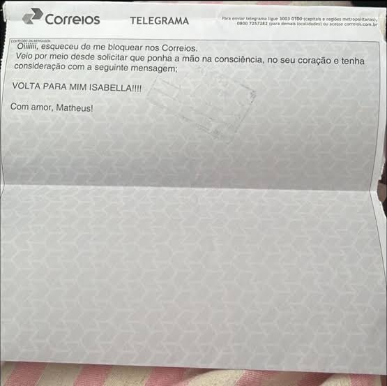 Uma história inusitada viralizou nas redes sociais nos últimos dias. Bloqueado nos meios modernos de comunicação, um homem enviou um telegrama para a ex-namorada, com uma mensagem fazendo piada com a situação: "Oi, esqueceu de me bloquear nos Correios". A criatividade logo divertiu os internautas. "O cara zerou o jogo do término", escreveu um internauta na publicação, feita pela mulher que recebeu o telegrama. A jovem publicou o recebimento na rede social X (antigo Twitter), causando a diversão de milhares de usuários da plataforma. Apesar de pouco utilizado, o telegrama continua ativo no Brasil, sendo mantido pelos Correios e utilizado em situações que exigem comprovação de envio, como notificações judiciais e comunicados urgentes e também para formalidades.