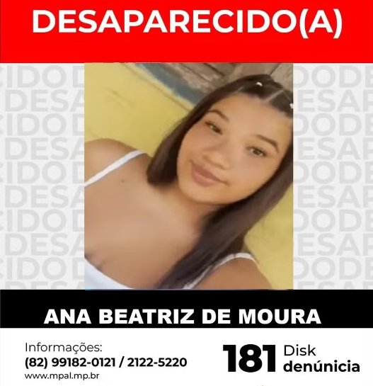 Ana Beatriz, de 15 anos, está desaparecida desde a última terça-feira (8), em Maceió. A jovem foi vista pela última vez ao embarcar em uma motocicleta por aplicativo no centro da cidade, com destino ao bairro Garça Torta, por volta das 12h47, cerca de quatro horas antes do horário habitual de saída do Instituto Federal de Alagoas (Ifal), onde cursa o técnico em Eletrotécnica.