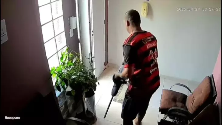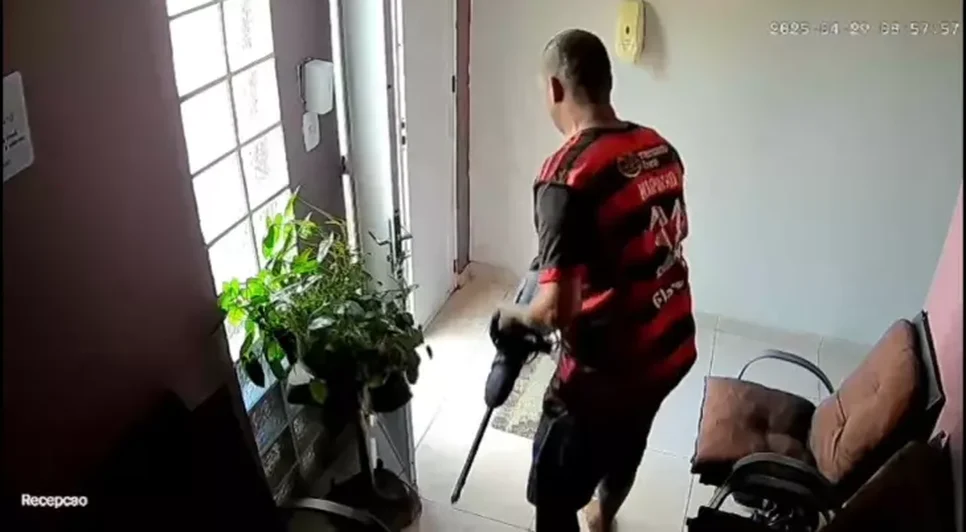 Nas imagens, o suspeito aparece usando uma camisa do Flamengo e bermuda preta. Ele entra na recepção da clínica, caminha até o local onde estava o equipamento da marca Makita10k, volta até a porta e, em seguida, comete o furto.
