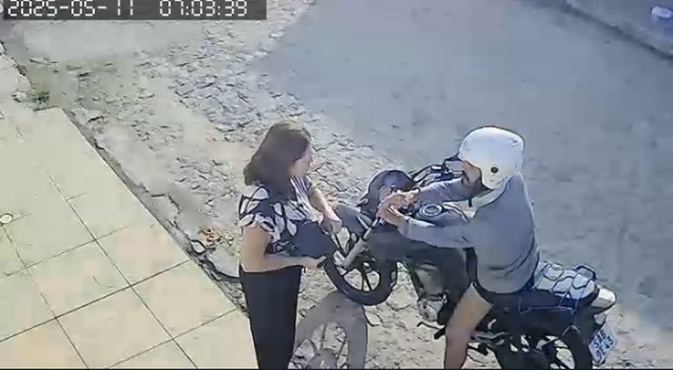 No vídeo, o suspeito, que usava capacete e pilotava uma moto de placa SAB9E43, se aproxima da vítima, a aborda e aguarda enquanto ela retira alguns pertences da bolsa para entregá-los. Após o roubo, o criminoso foge do local com os objetos em mãos.