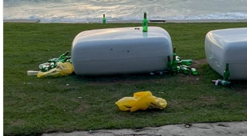 Garrafas de bebidas alcoólicas, sacolas plásticas, copos descartáveis e bitucas de cigarro foram flagrados espalhados pela área de convivência da orla, principalmente sobre a grama.
