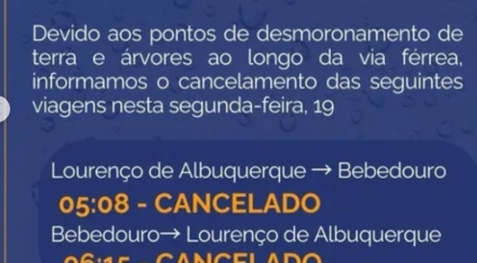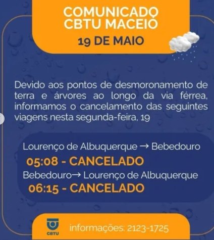 A Companhia Brasileira de Trens Urbanos de Maceió (CBTU) informou, em nota oficial, o cancelamento de duas viagens programadas para esta segunda-feira (19). A decisão foi devido aos impactos das fortes chuvas que atingiriam a capital alagoana desde o último sábado (17).