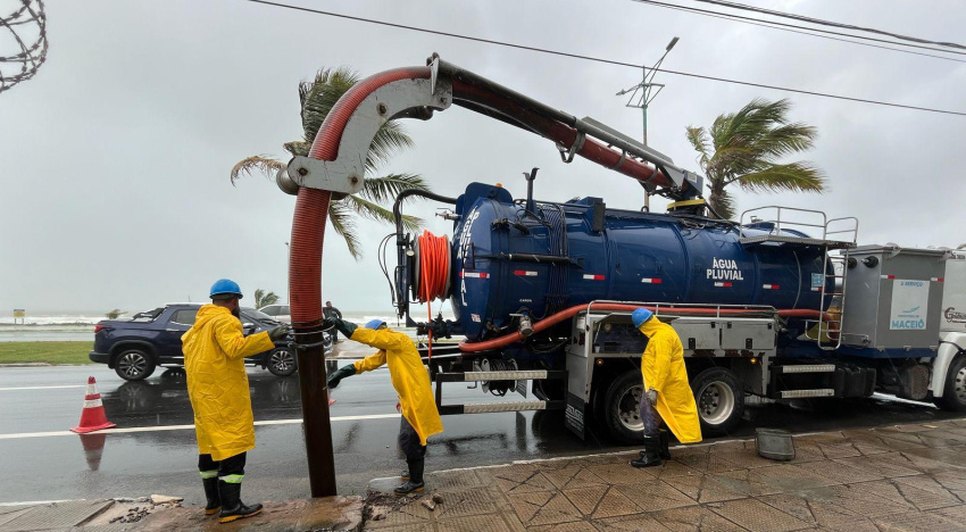 Em pontos críticos, como nos bairros do Benedito Bentes e do Pontal da Barra, equipes da Secretaria Municipal de Infraestrutura de Maceió (Seminfra) atuaram na desobstrução de galerias pluviais e hidrojateamento.