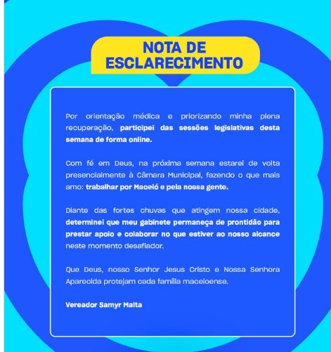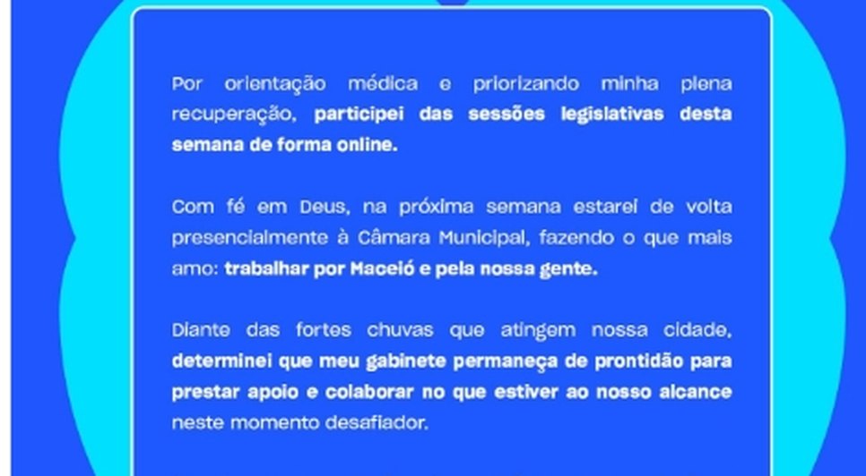 O vereador adiantou que, com fé e disposição, estará de volta presencialmente à Câmara Municipal na próxima semana, retomando integralmente as atividades legislativas. “Fazer o que mais amo: trabalhar por Maceió e pela nossa gente”, reforçou.