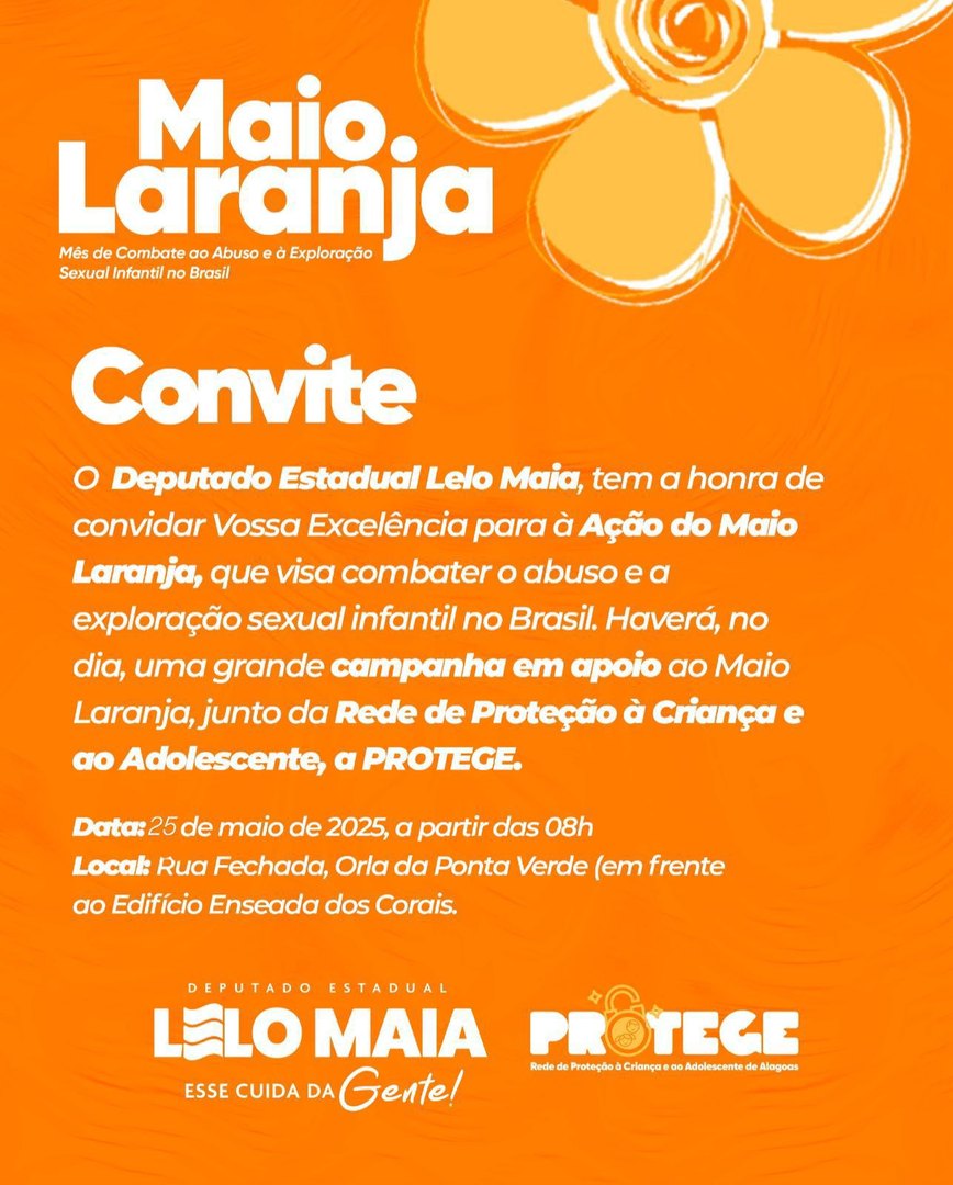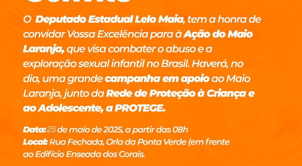 Mobilizar a sociedade no mês dedicado a combater o abuso e a exploração sexual de crianças e adolescentes. Esse será o objetivo da Ação do Maio Laranja, a ser realizada a partir das 8 da manhã desse domingo (25), na Rua Fechada da Orla de Ponta Verde, em Maceió, em frente ao Edifício Enseada dos Corais.