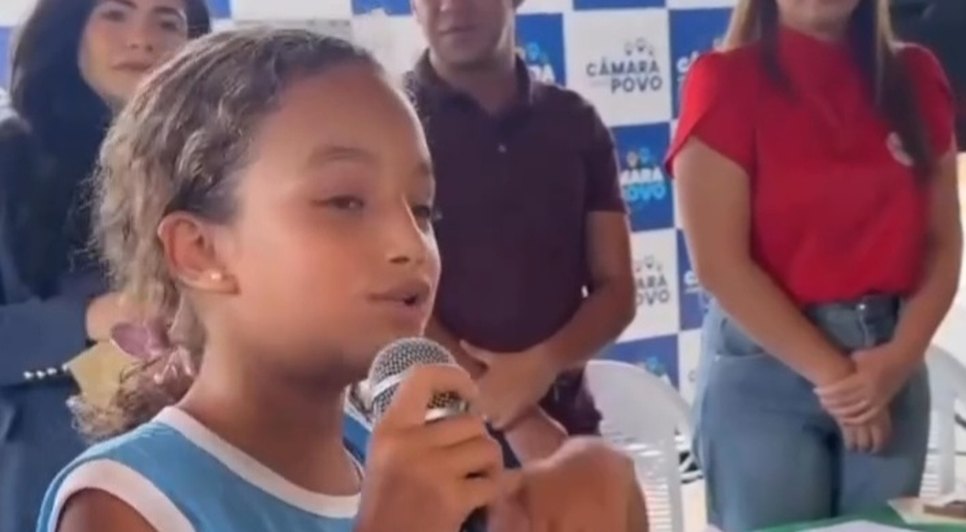 Aproveitando a oportunidade com o microfone, a pequena reclamou da merenda e cobrou mais carne na alimentação dela e dos colegas.