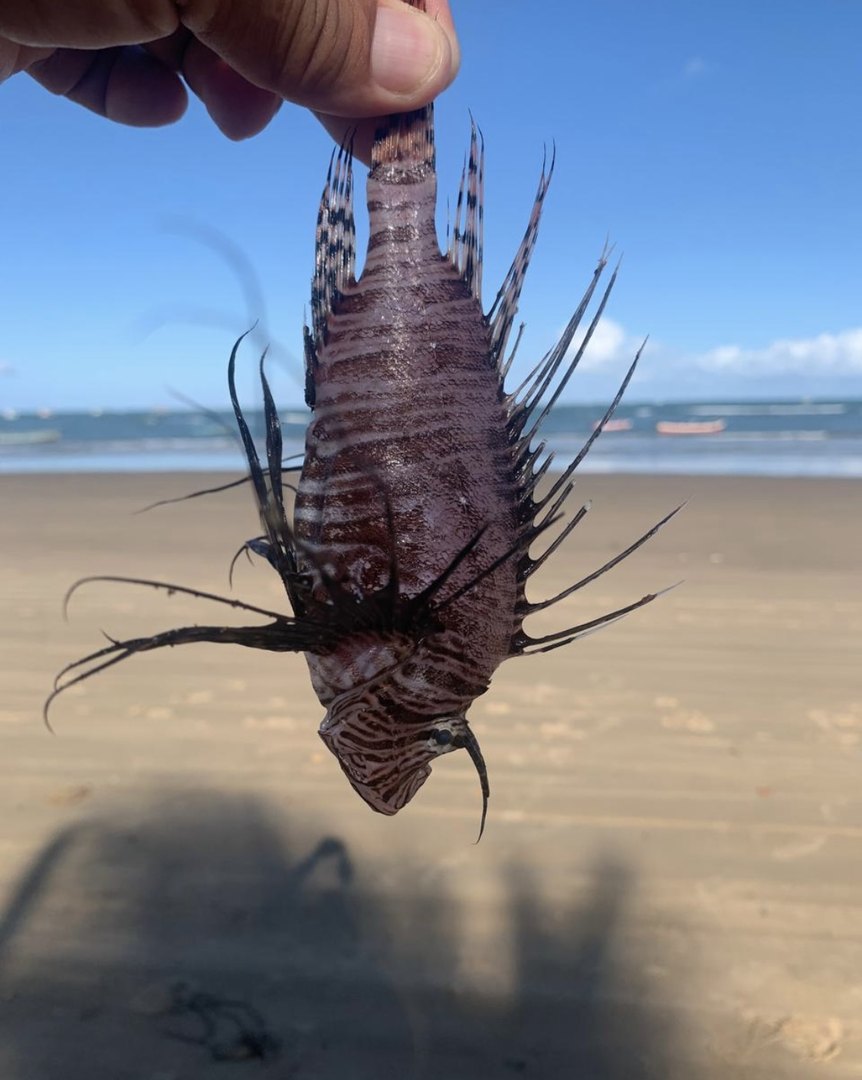 Pescadores do Pontal do Peba, em Piaçabuçu, capturaram um exemplar do peixe-leão, também conhecido como peixe-dragão, uma das espécies mais perigosas do mar. Considerado invasor, o animal possui 18 espinhos com toxinas que podem causar acidentes graves e, em casos extremos, levar à morte.