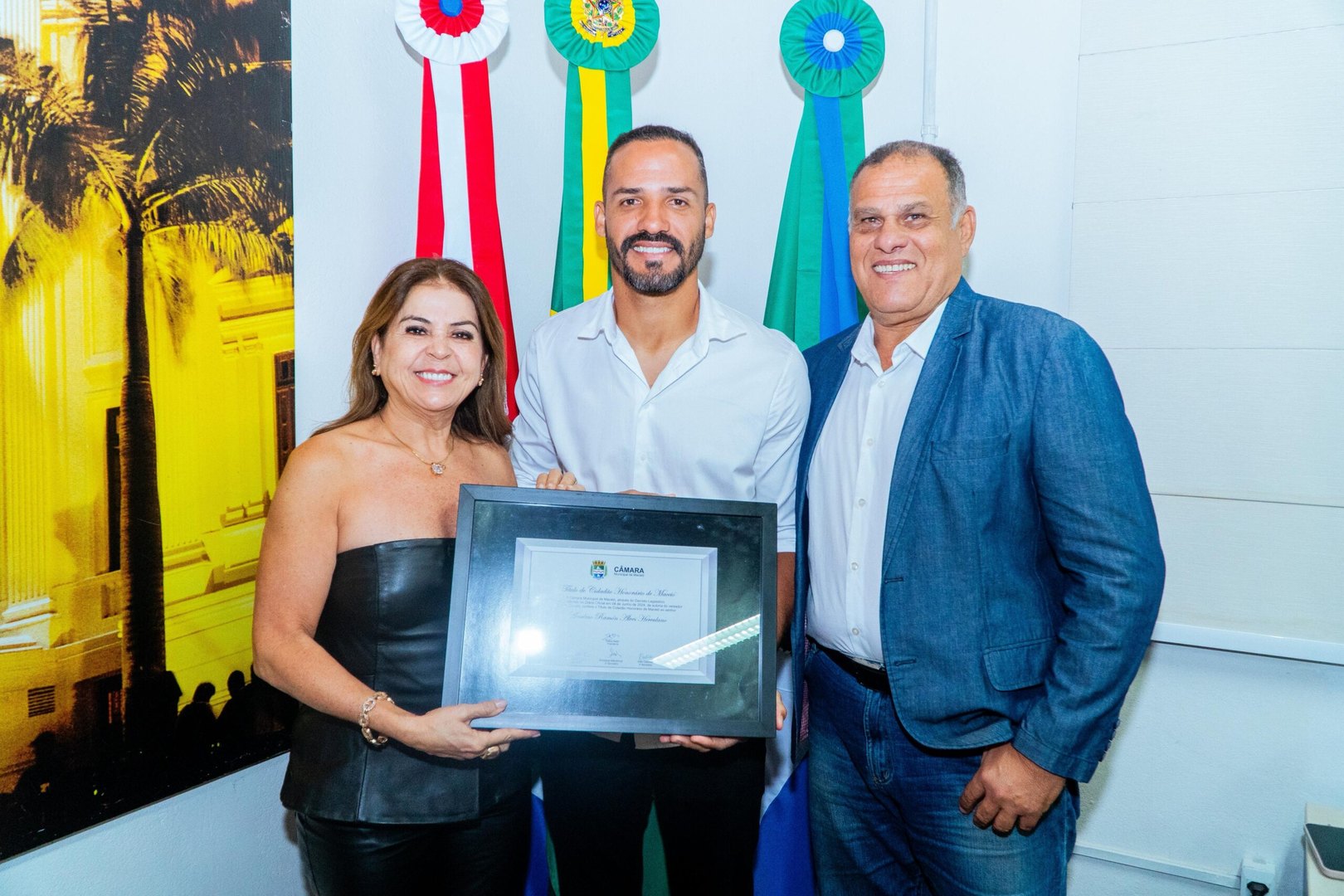 A Câmara Municipal entregou, nesta sexta-feira (13), o Título de Cidadão Honorário de Maceió, ao jogador de futebol, Anselmo Ramon, considerado o artilheiro do século quando vestiu a camisa do Clube de Regatas Brasil (CRB). A homenagem foi entregue pela vice-presidente do Poder Legislativo, vereadora Silvania Barbosa e pelo vereador Eduardo Canuto, que foi autor do decreto aprovado por unanimidade pelo parlamento em 4 de junho de 2024.