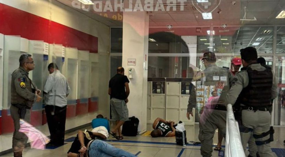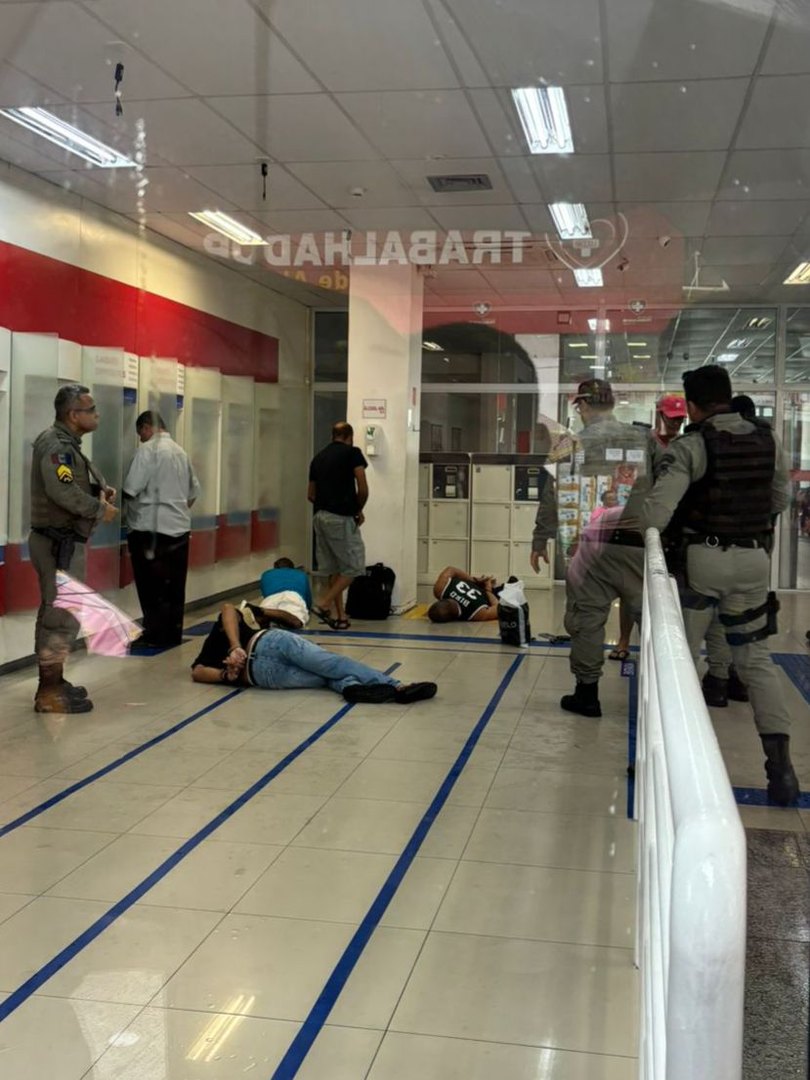 Imagens que circulam nas redes sociais mostram os suspeitos deitados no chão do banco. A movimentação teria ocorrido por volta das 10h47.