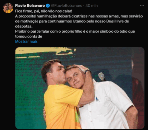 “Fica firme, pai, não vão nos calar!”, escreveu Flávio. “A proposital humilhação deixará cicatrizes nas nossas almas, mas servirão de motivação para continuarmos lutando pelo nosso Brasil livre de déspotas.”