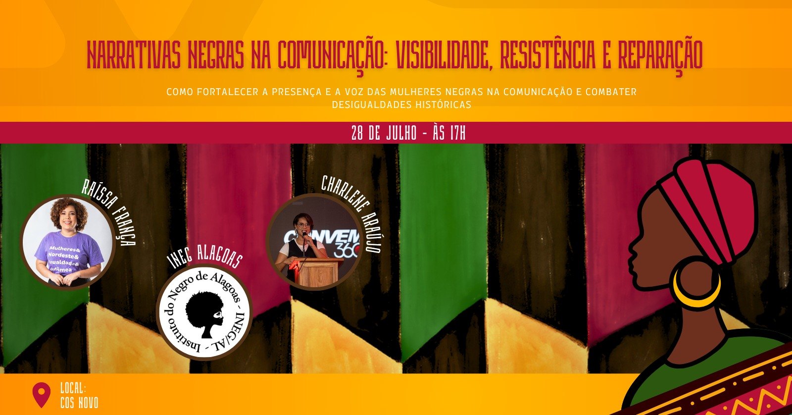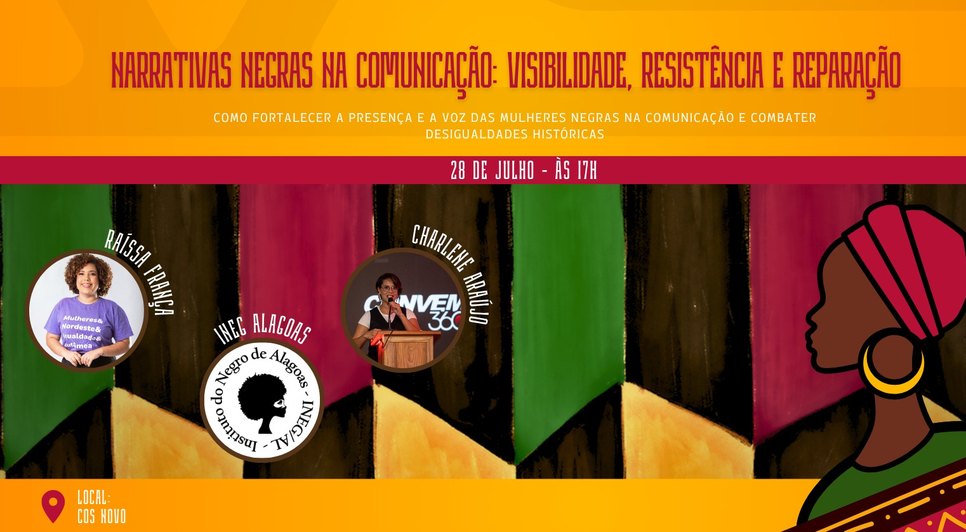 As jornalistas Raíssa França, cofundadora do portal Eufemea; Emanuella Lima, assessora de comunicação do Instituto Negro de Alagoas (INEG/AL); e Charlene Araújo, jornalista e mestre de cerimônias, vão debater temas como o silenciamento e a hipervisibilidade da mulher negra na mídia, os estereótipos de gênero na cobertura jornalística, a comunicação como ferramenta de denúncia e mobilização social, além da importância da representatividade e da autoria negra na construção das narrativas midiáticas.
