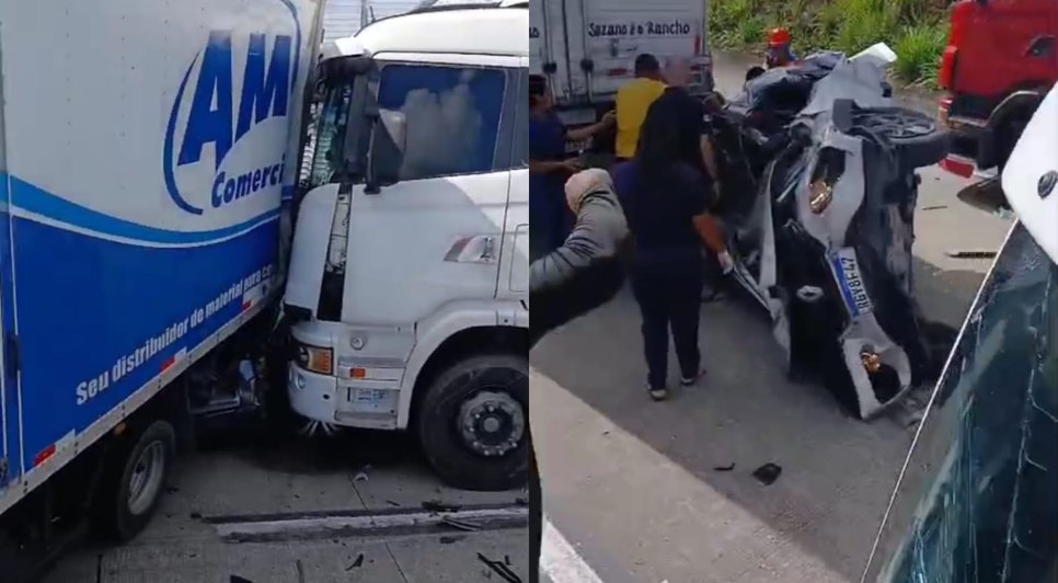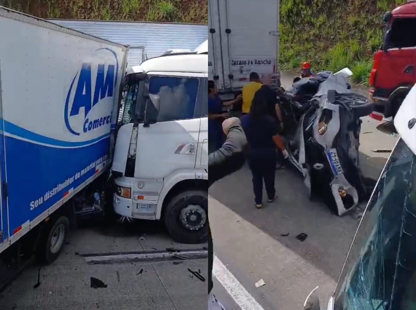 A colisão envolveu uma carreta, um caminhão-baú, um guincho de pequeno porte e dois veículos de passeio. Uma pessoa do sexo masculino, que estava em um Renault Kwid, ficou presa às ferragens e não resistiu aos ferimentos, vindo a óbito no local.