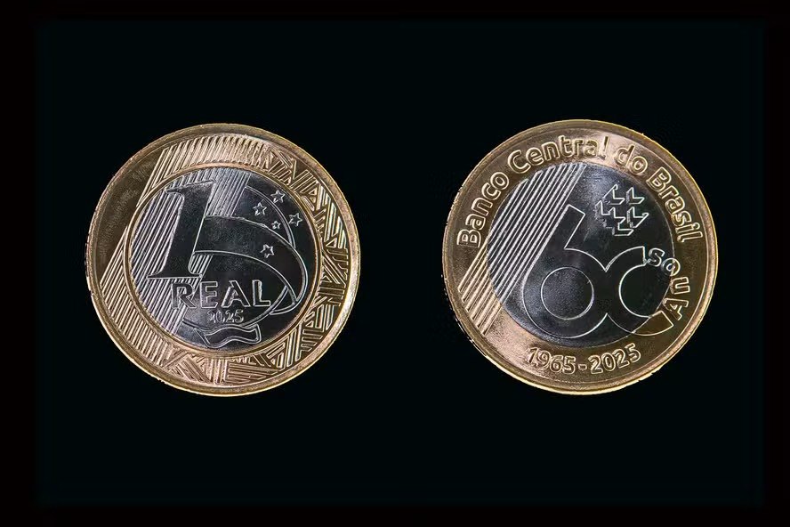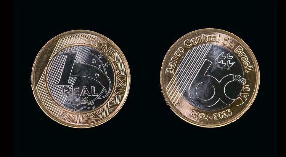 A moeda comemorativa tem, na frente, o selo dos 60 anos do BC, a marca da instituição e linhas diagonais. No anel dourado, aparecem as inscrições “Banco Central do Brasil” e os anos “1965-2025”. O verso segue o modelo tradicional da moeda de R$ 1 em circulação.