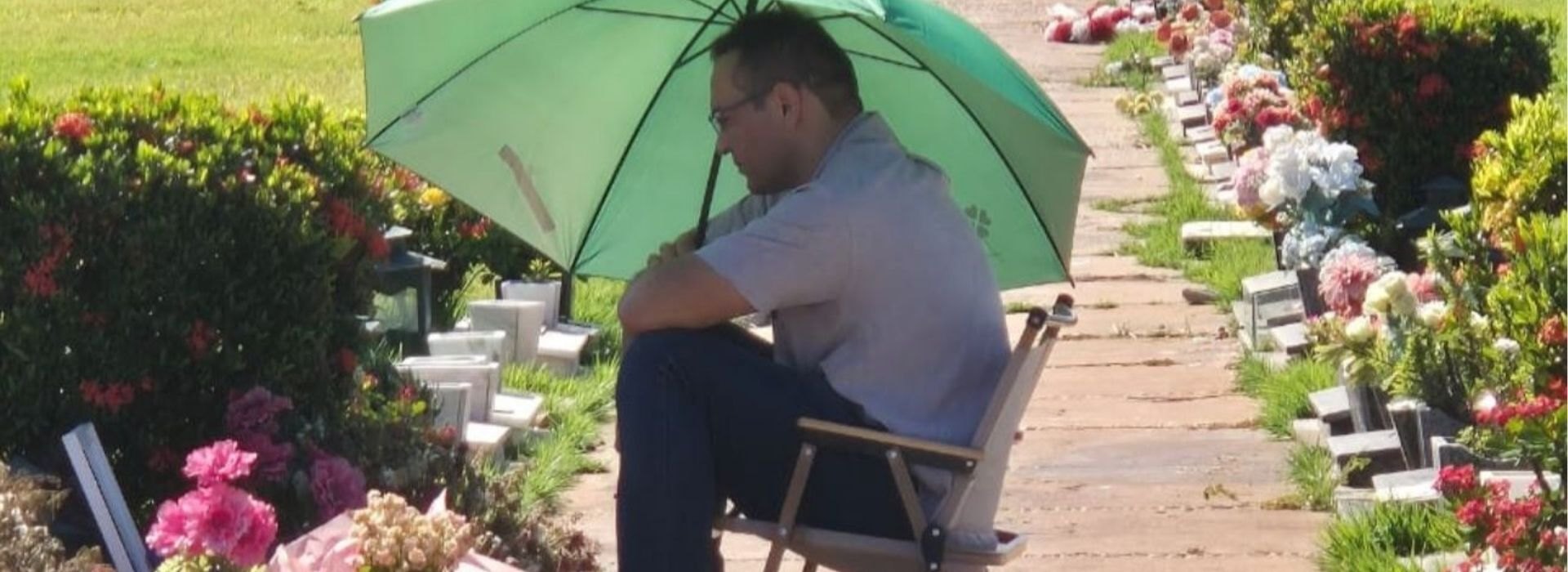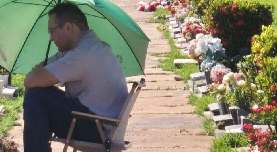 Ele permaneceu sentado em uma cadeirinha ao lado do túmulo da filha, enterrada na última quarta-feira (6), olhando fixamente para a lápide coberta de flores e mensagens de homenagem. Visivelmente emocionado, Cláudio permaneceu no local por horas.