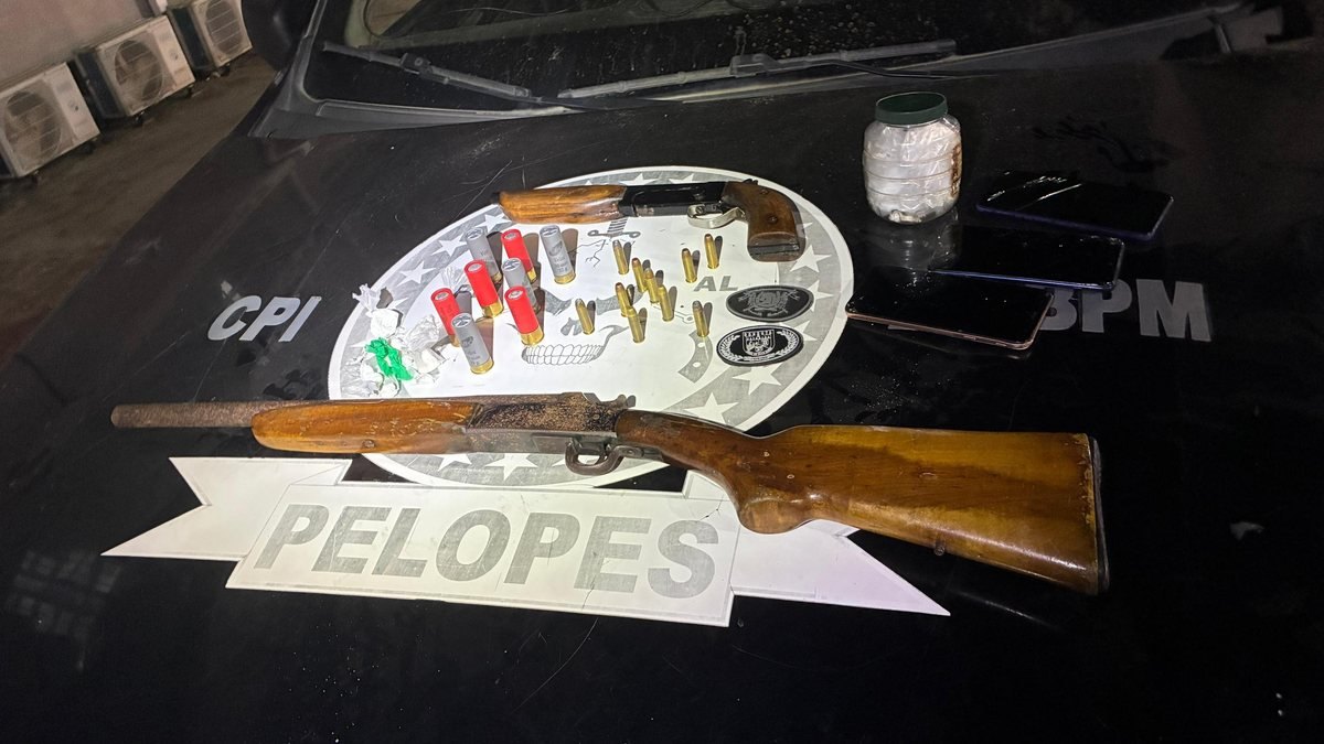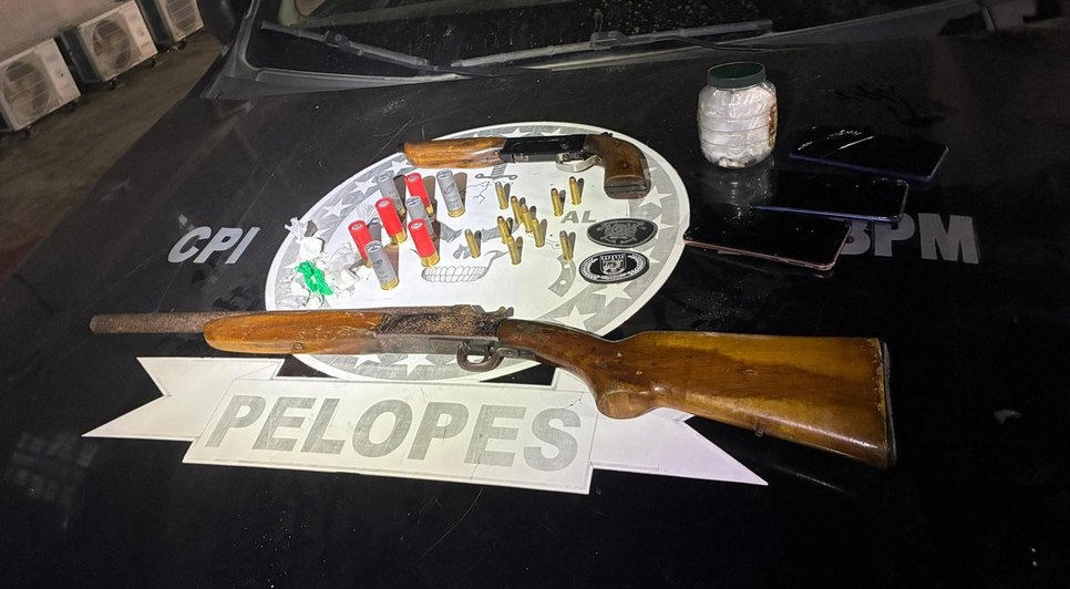 O suspeito foi localizado em frente à própria residência por meio de monitoramento com drone. Com autorização dele e da companheira, os policiais revistaram o imóvel e encontraram três celulares, um recipiente com vestígios de maconha e diversos sacos plásticos, possivelmente usados para embalar drogas. No quintal, dentro de um barraco de taipa, estavam enterradas duas espingardas uma calibre 12 e outra de calibre não identificado 18 munições e cerca de 19 gramas de cocaína.