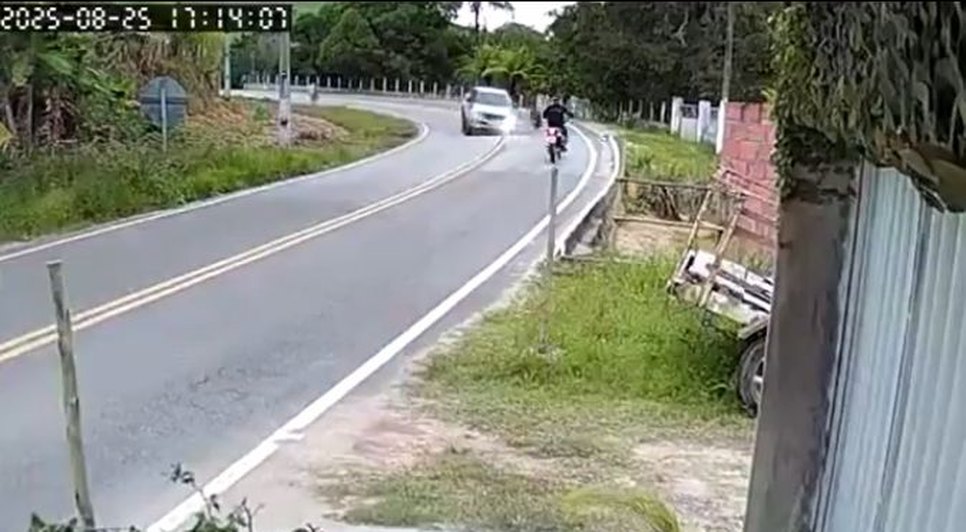 Um vídeo de uma câmera de segurança mostra o momento em que um motociclista quase é atingido por um pneu que se soltou de uma caminhonete em movimento, na comunidade Bom Despacho, em Passo de Camaragibe, no interior de Alagoas.
