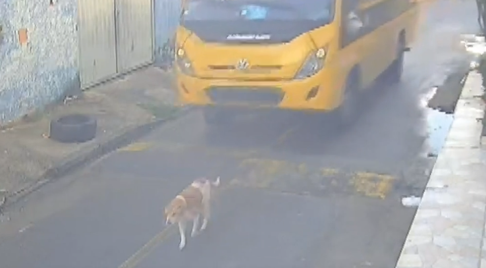Um cachorro foi atingido por um ônibus escolar da Prefeitura de Marechal Deodoro, na região metropolitana de Maceió, na quarta-feira (27). As câmeras de segurança registraram o momento em que o animal entra na pista e é atropelado, mesmo com o veículo ainda a distância.