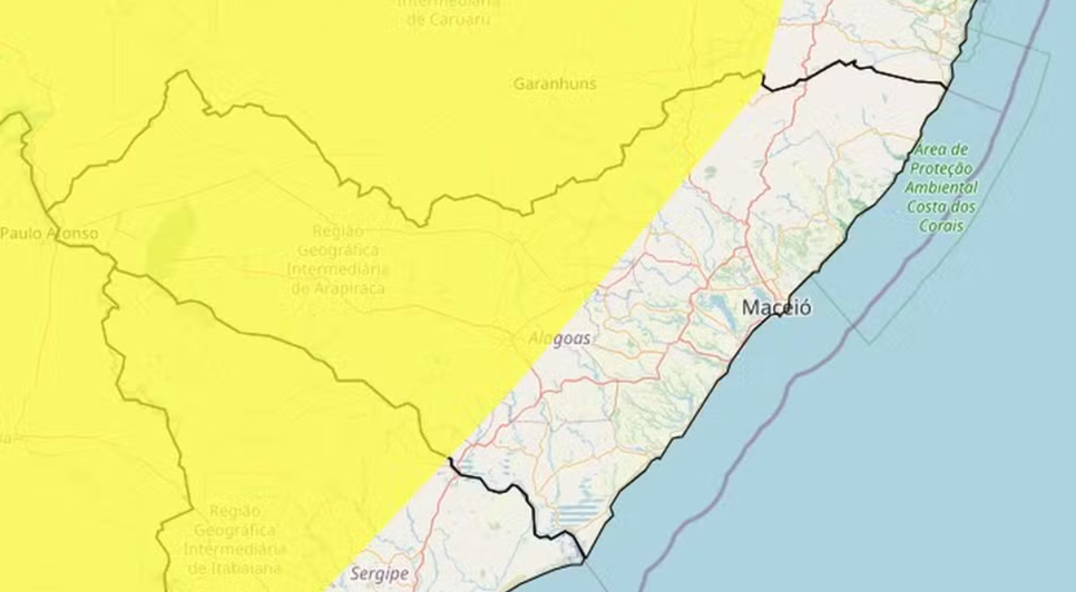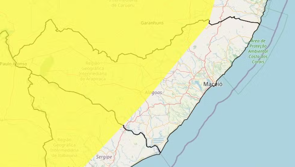 O Instituto Nacional de Meteorologia (Inmet) emitiu, nesta quinta-feira (25), um alerta amarelo de perigo potencial para ventos fortes em 53 municípios de Alagoas. O aviso é válido até a noite de sexta-feira (26) e prevê rajadas de vento entre 40 km/h e 60 km/h.