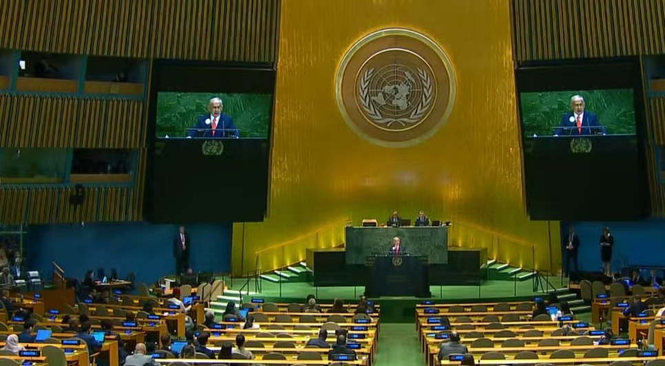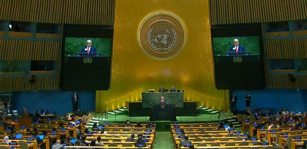 Delegações de diversos países, incluindo a brasileiro, se retiraram do plenário da Assembleia Geral da Organização das Nações Unidas (ONU), nesta sexta-feira (26) no momento em que o primeiro-ministro de Israel, Benjamin Netanyahu, subiu ao parlatório para discursar.O protesto foi combinado previamente entre as delegações, em crítica aos ataques israelenses contra a Faixa de Gaza, que já duram quase dois anos e já fizeram mais de 60 mil vítimas. Quando Netanyahu iniciou seu discurso, o mestre de cerimônia pediu para que as delegações mantessem a ordém. "Ordem na sala, por favor!" afirmou por diversas vezes.