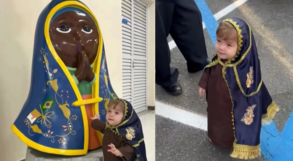 A pequena Maria Clara roubou a cena durante uma visita ao Santuário Nacional de Aparecida, em São Paulo, ao aparecer vestida como Nossa Senhora Aparecida. A caracterização da menina chamou a atenção de fiéis e visitantes, que registraram o momento especial.