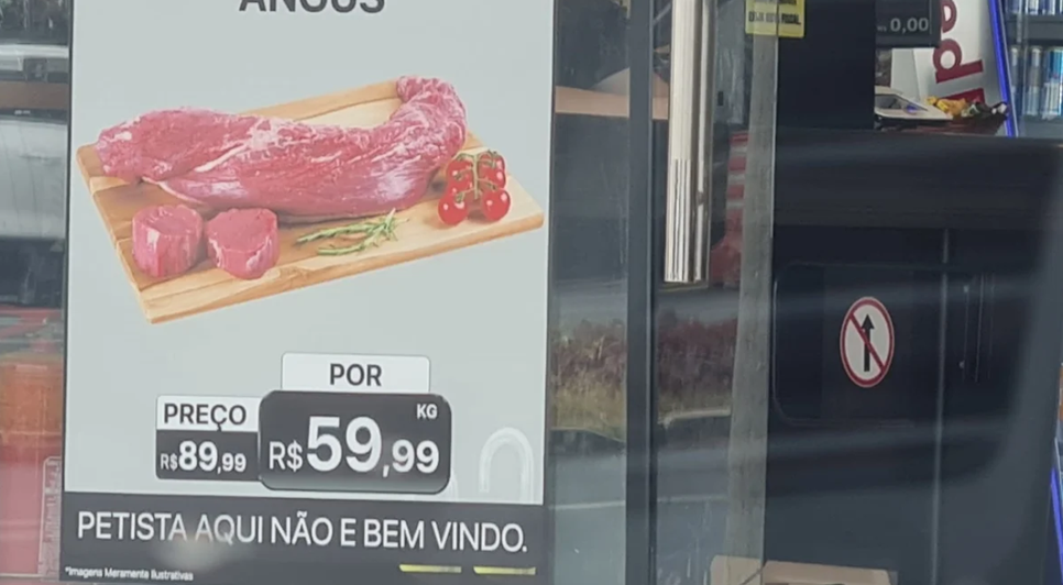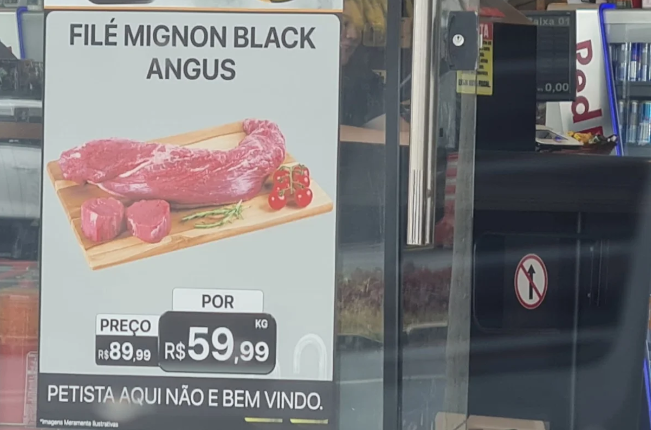 Uma loja do Frigorífico Goiás, localizada em uma área nobre de Goiânia, gerou polêmica nesta semana ao fixar um cartaz na entrada com a mensagem: “Petista aqui não é bem-vindo”. O anúncio, que divulgava o preço do quilo de filé mignon black angus, incluía a orientação política em letras maiúsculas, chamando atenção de clientes e internautas.